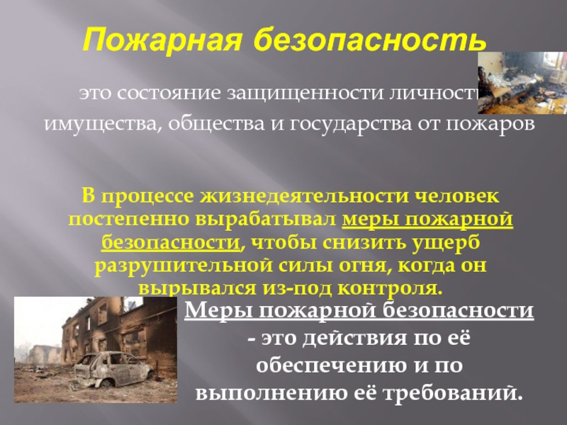 В процессе жизнедеятельности человек постепенно вырабатывал меры пожарной безопасности, чтобы снизить ущерб разрушительной силы огня, когда он вырывался из-под контроля.