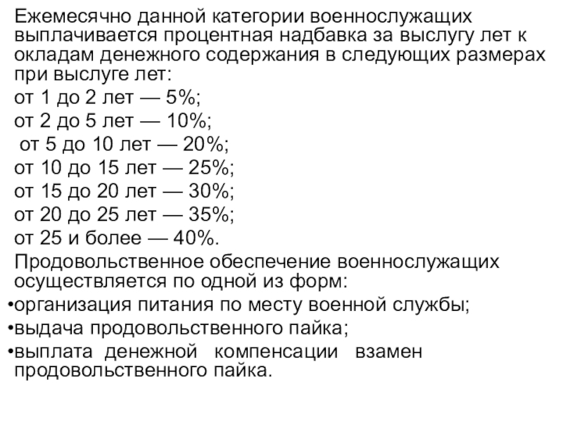 Слайд 15Ежемесячно данной категории военнослужащих выплачивается процентная надбавка за выслугу лет к