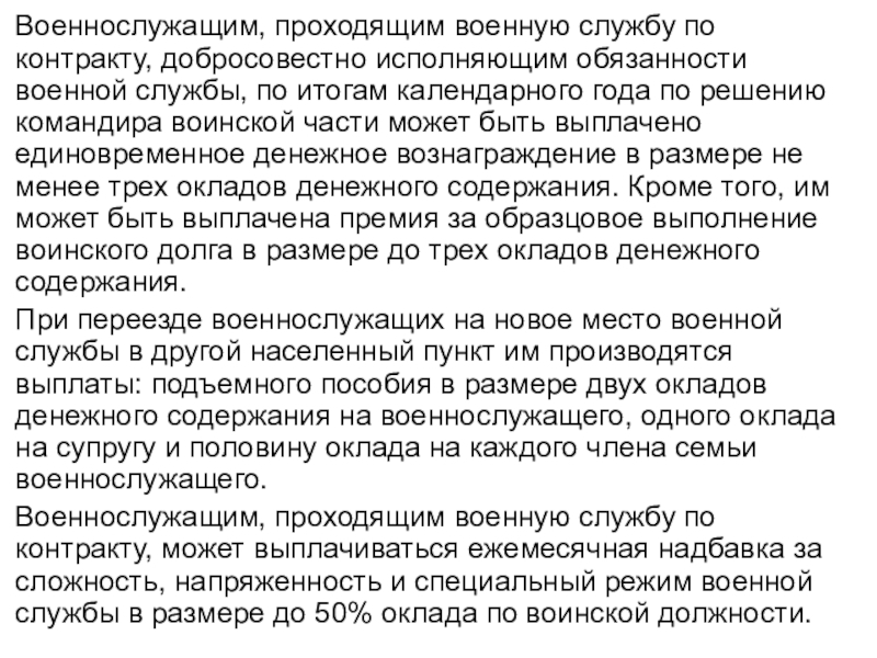 Слайд 14Военнослужащим, проходящим военную службу по контракту, добросовестно исполняющим обязанности военной службы,