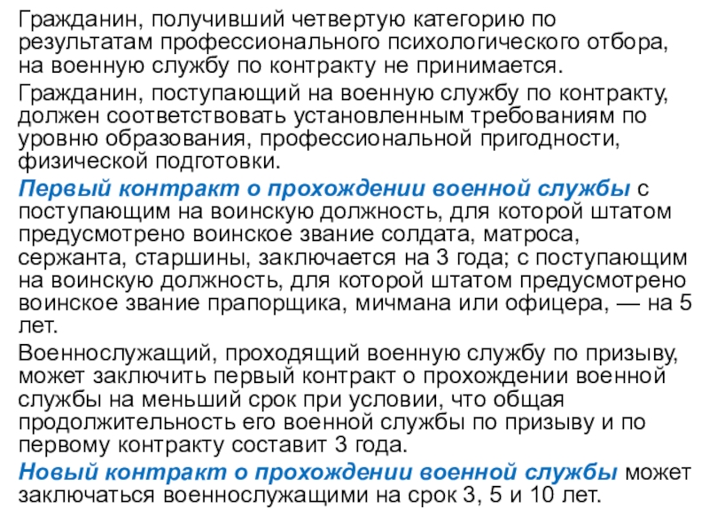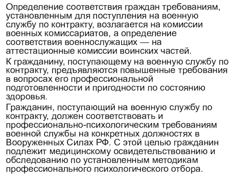 К гражданину, поступающему на военную службу по контракту, предъявляются повышенные требования в вопросах его профессиональной подготовленности и пригодности по состоянию здоровья.