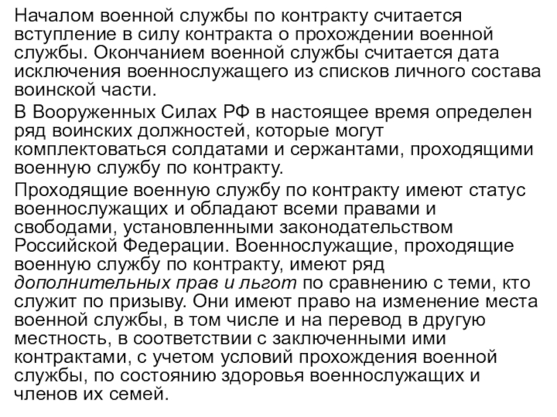 Слайд 10Началом военной службы по контракту считается вступление в силу контракта о