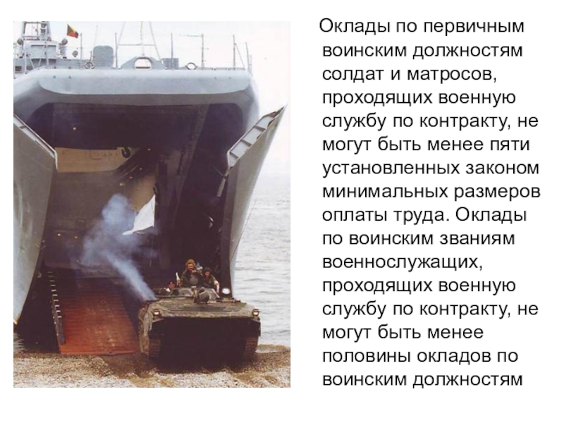 Слайд 13 Оклады по первичным воинским должностям солдат и матросов, проходящих