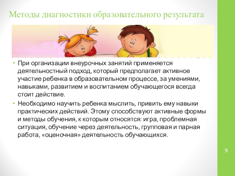 Необходимо научить ребенка мыслить, привить ему навыки практических действий. Этому способствуют активные формы и методы обучения, к которым относятся: игра, проблемная ситуация, обучение через деятельность, групповая и парная работа, «оценочная» деятельность обучающихся.