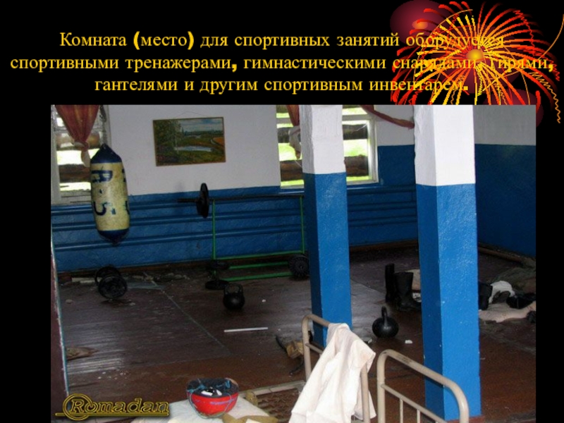 Слайд 7Комната (место) для спортивных занятий оборудуется спортивными тренажерами, гимнастическими снарядами, гирями,