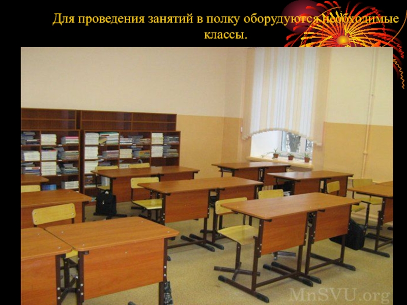 Слайд 10Для проведения занятий в полку оборудуются необходимые классы.