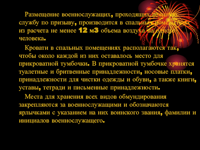 Размещение военнослужащих, проходящих военную службу по призыву, производится в спальных помещениях