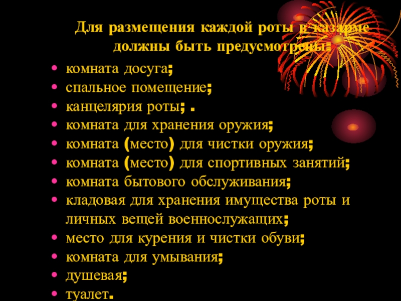 Слайд 3Для размещения каждой роты в казарме должны быть предусмотрены: