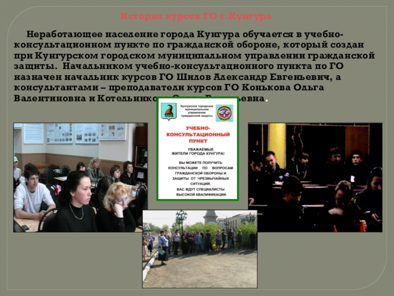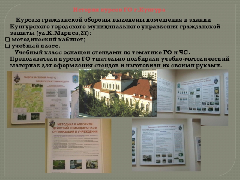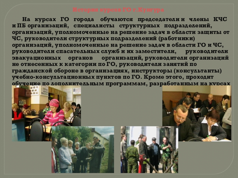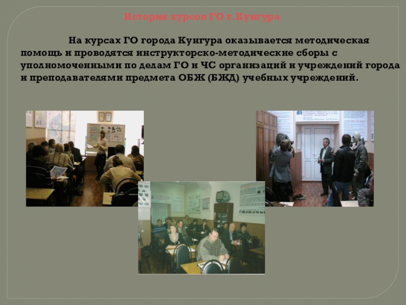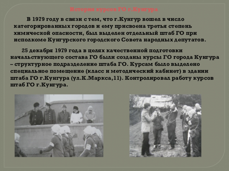 25 декабря 1979 года в целях качественной подготовки начальствующего состава ГО были созданы курсы ГО города Кунгура – структурное подразделение штаба ГО. Курсам было выделено специальное помещение (класс и методический кабинет) в здании штаба ГО г.Кунгура (ул.К.Маркса,11). Контролировал работу курсов штаб ГО г.Кунгура.