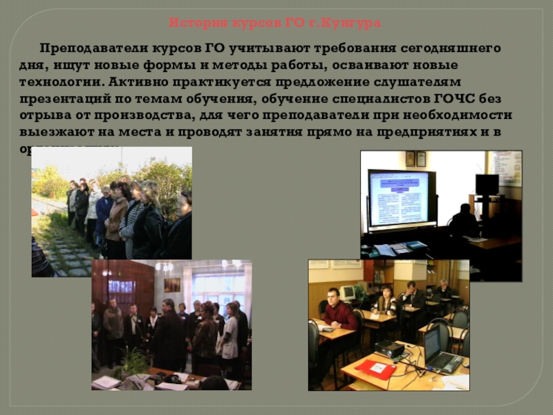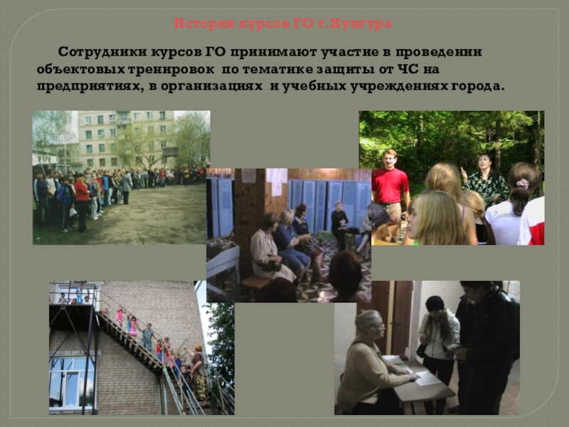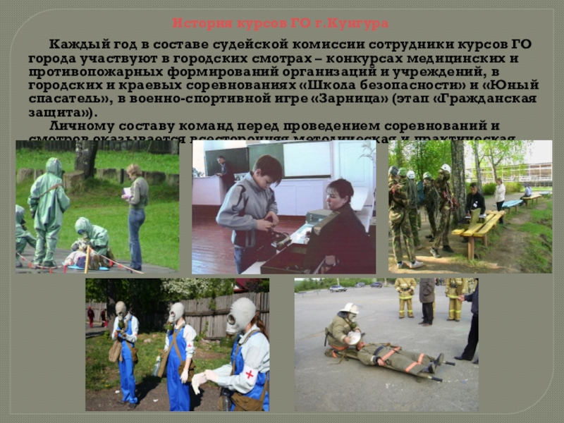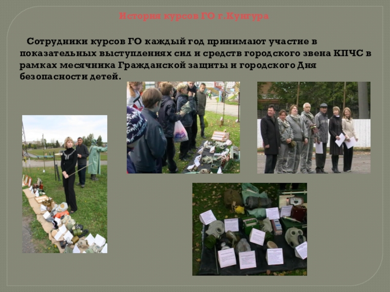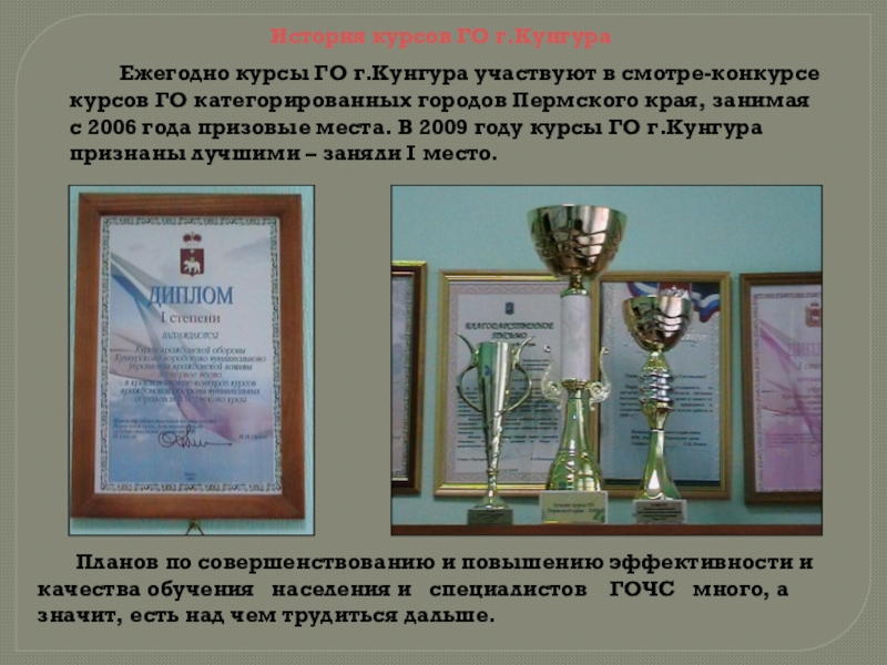 Ежегодно курсы ГО г.Кунгура участвуют в смотре-конкурсе курсов ГО категорированных городов Пермского края, занимая с 2006 года призовые места. В 2009 году курсы ГО г.Кунгура признаны лучшими – заняли I место.