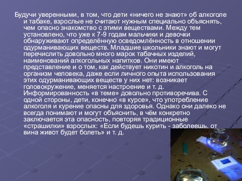 и табаке, взрослые не считают нужным специально объяснять, чем опасно знакомство с этими веществами. Между тем установлено, что уже к 7-9 годам мальчики и девочки обнаруживают определённую осведомлённость в отношении одурманивающих веществ. Младшие школьники знают и могут перечислить довольно много марок табачных изделий, наименований алкогольных напитков. Они имеют представление и о том, как действует никотин и алкоголь на организм человека, даже если личного опыта использования этих одурманивающих веществ у них нет: возникает головокружение, меняется настроение и т. д. Информированность «в теме» довольно противоречива. С одной стороны, дети, конечно «в курсе», что употребление алкоголя и курение опасны для здоровья. Однако они далеко не всегда понимают и могут объяснить, в чём конкретно заключается эта опасность, повторяя традиционные «страшилки» взрослых: «Если будешь курить - заболеешь, от вина живот будет болеть» и т. д.