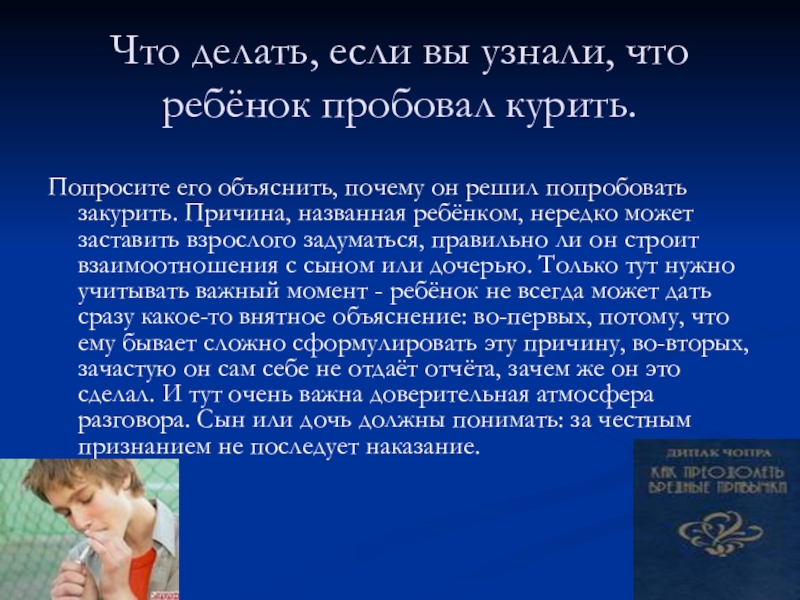 почему он решил попробовать закурить. Причина, названная ребёнком, нередко может заставить взрослого задуматься, правильно ли он строит взаимоотношения с сыном или дочерью. Только тут нужно учитывать важный момент - ребёнок не всегда может дать сразу какое-то внятное объяснение: во-первых, потому, что ему бывает сложно сформулировать эту причину, во-вторых, зачастую он сам себе не отдаёт отчёта, зачем же он это сделал. И тут очень важна доверительная атмосфера разговора. Сын или дочь должны понимать: за честным признанием не последует наказание.