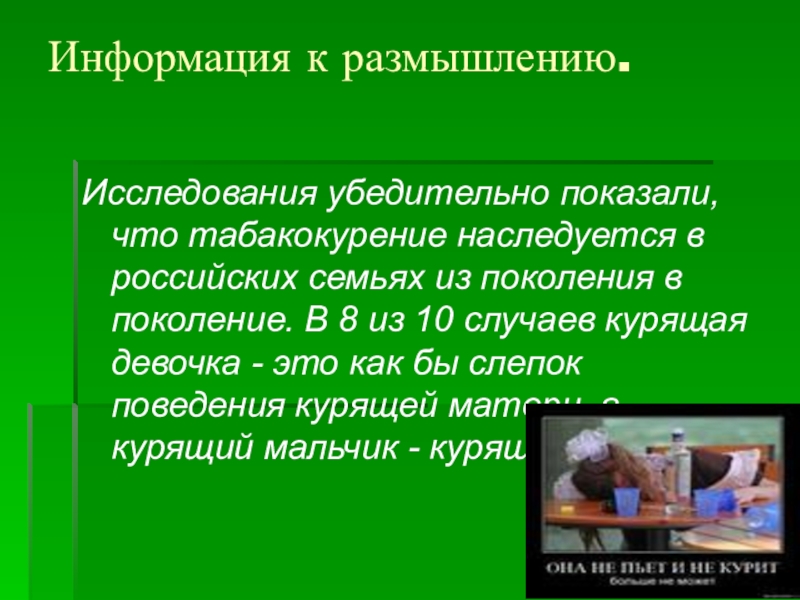 из поколения в поколение. В 8 из 10 случаев курящая девочка - это как бы слепок поведения курящей матери, а курящий мальчик - курящего отца