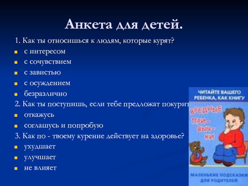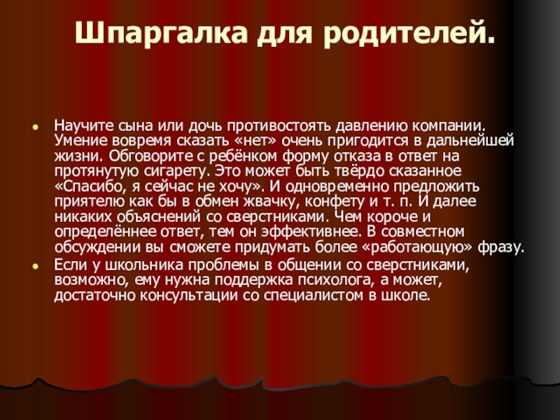 сказать «нет» очень пригодится в дальнейшей жизни. Обговорите с ребёнком форму отказа в ответ на протянутую сигарету. Это может быть твёрдо сказанное «Спасибо, я сейчас не хочу». И одновременно предложить приятелю как бы в обмен жвачку, конфету и т. п. И далее никаких объяснений со сверстниками. Чем короче и определённее ответ, тем он эффективнее. В совместном обсуждении вы сможете придумать более «работающую» фразу.