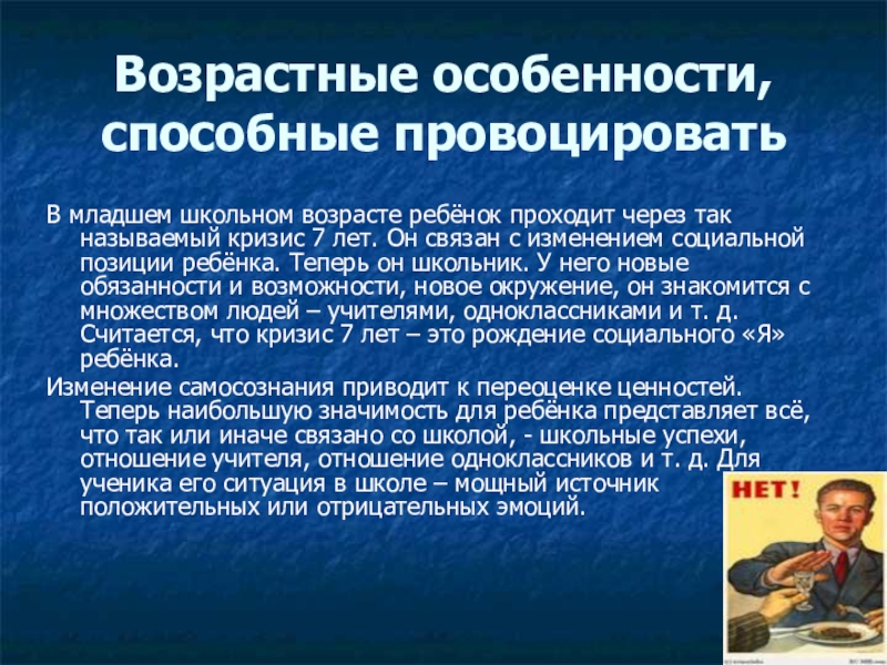 называемый кризис 7 лет. Он связан с изменением социальной позиции ребёнка. Теперь он школьник. У него новые обязанности и возможности, новое окружение, он знакомится с множеством людей – учителями, одноклассниками и т. д. Считается, что кризис 7 лет – это рождение социального «Я» ребёнка.