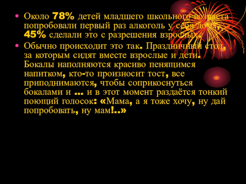 Слайд 12Около 78% детей младшего школьного возраста попробовали первый раз алкоголь у