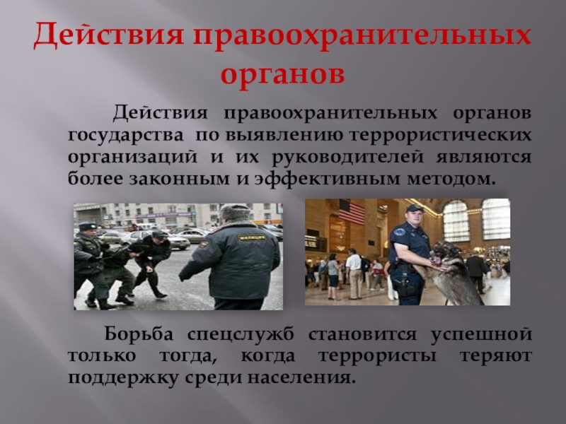 Действия правоохранительных органов   Действия правоохранительных органов государства по выявлению террористических организаций и их руководителей являются