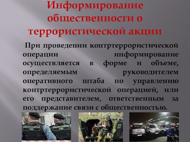Информирование общественности о террористической акции  При проведении контртеррористической операции информирование  осуществляется в форме и объеме,