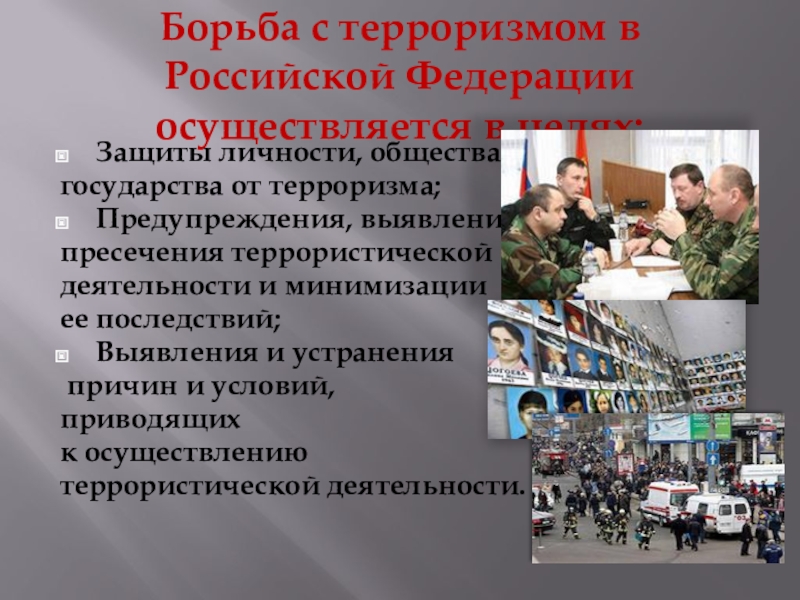 Борьба с терроризмом в Российской Федерации осуществляется в целях:Защиты личности, общества и государства от терроризма;Предупреждения, выявления,пресечения террористическойдеятельности