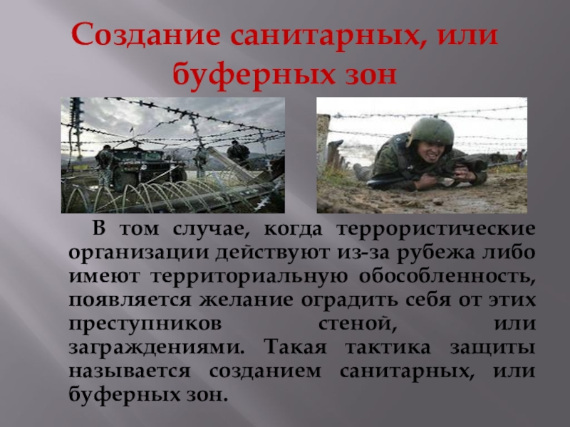 том случае, когда террористические организации действуют из-за рубежа либо имеют территориальную обособленность, появляется желание оградить себя от этих преступников стеной, или заграждениями. Такая тактика защиты называется созданием санитарных, или буферных зон.