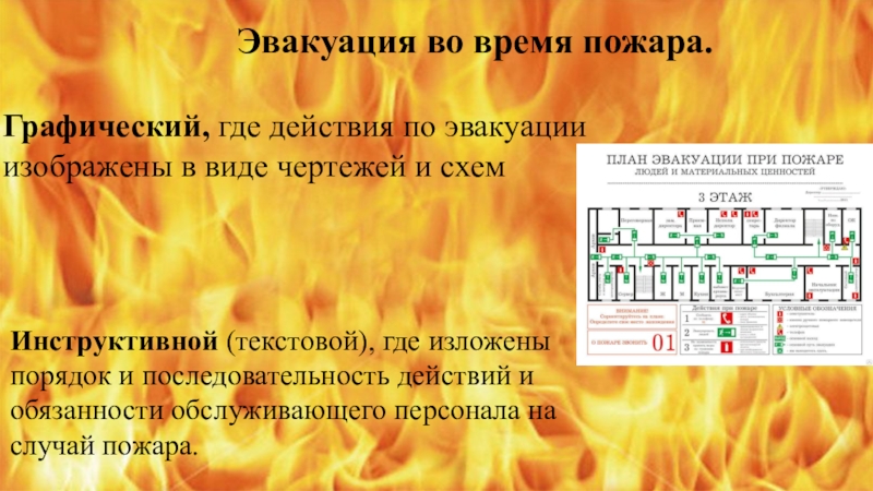 Инструктивной (текстовой), где изложены порядок и последовательность действий и обязанности обслуживающего персонала на случай пожара.