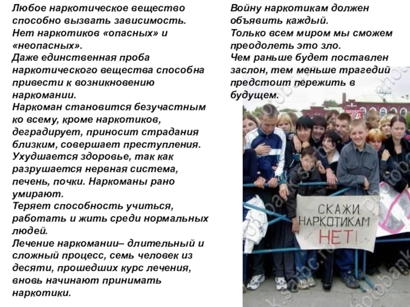 Наркоман становится безучастным ко всему, кроме наркотиков, деградирует, приносит страдания близким, совершает преступления.