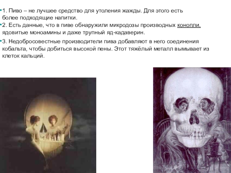 2. Есть данные, что в пиве обнаружили микродозы производных конопли, ядовитые моноамины и даже трупный яд-кадаверин.