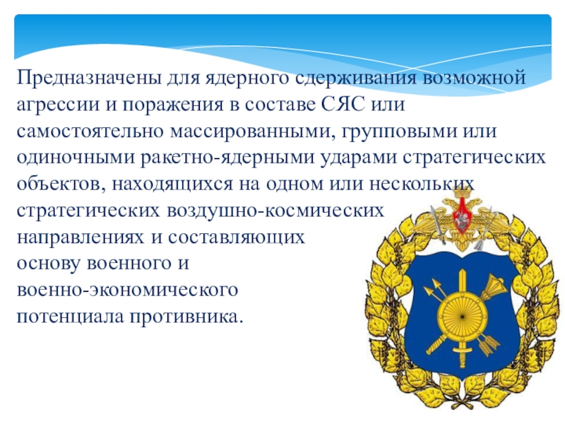 Слайд 14Предназначены для ядерного сдерживания возможной агрессии и поражения в составе СЯС