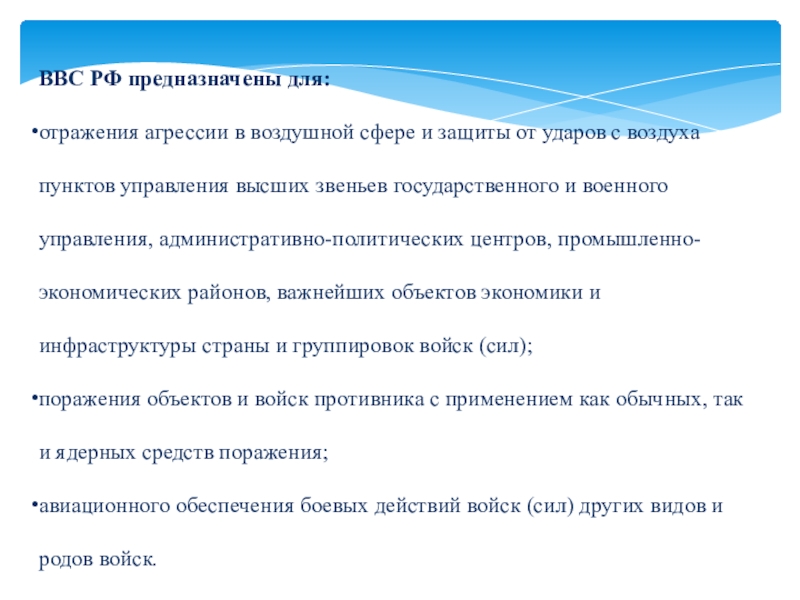 ударов с воздуха пунктов управления высших звеньев государственного и военного управления, административно-политических центров, промышленно-экономических районов, важнейших объектов экономики и инфраструктуры страны и группировок войск (сил);