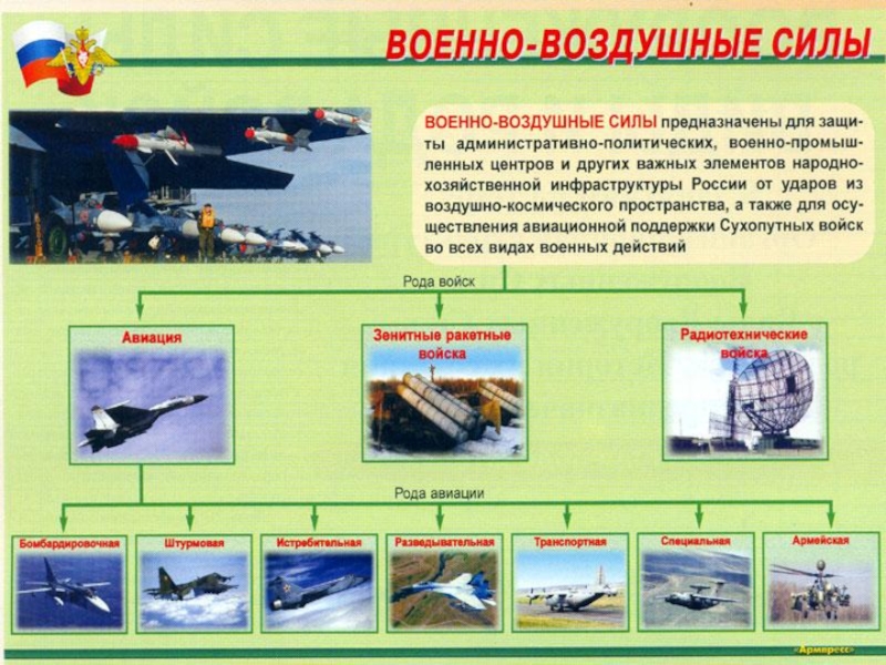 Виды Вооруженных Сил в свою очередь, подразделяются на рода войск, (рода авиации в ВВС, рода сил в ВМФ) и специальные войска и состоят из объединений, соединений, частей и подразделений, которые дислоцируются на территории стратегических направлений.