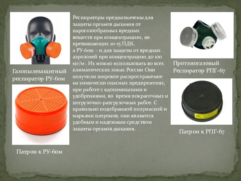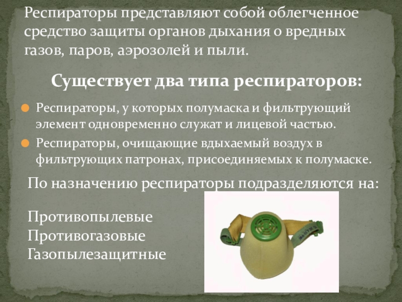 Респираторы представляют собой облегченное средство защиты органов дыхания о вредных газов, паров, аэрозолей и пыли.