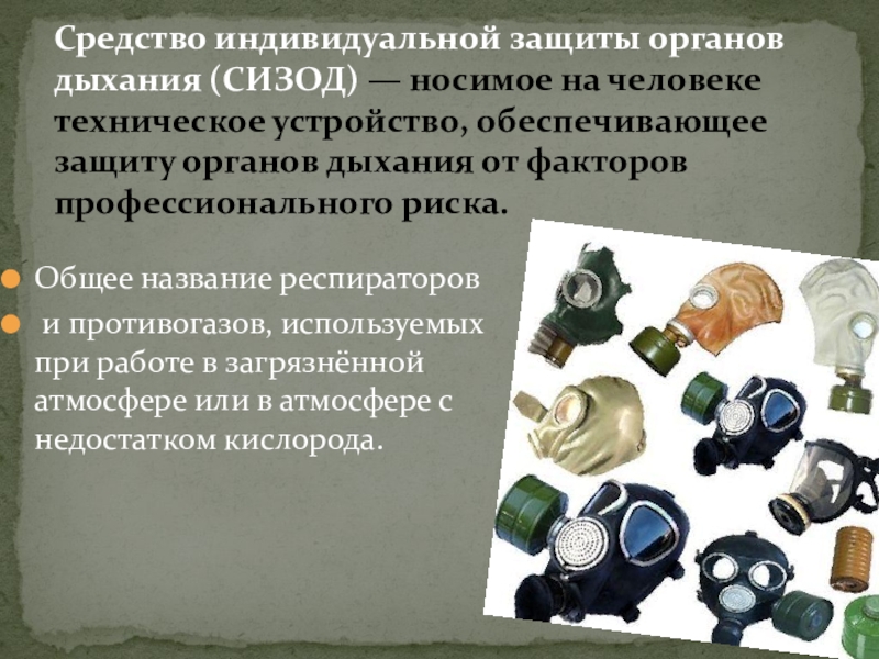 Средство индивидуальной защиты органов дыхания (СИЗОД) — носимое на человеке техническое устройство, обеспечивающее защиту органов дыхания от факторов профессионального риска.