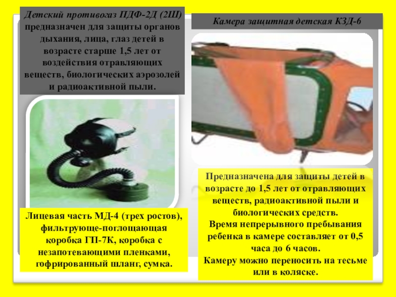Предназначен для защиты органов дыхания и кожи детей в возрасте до 1,5 лет от ОВ, РП, АХОВ, радионуклидов йода и его органических соединений .