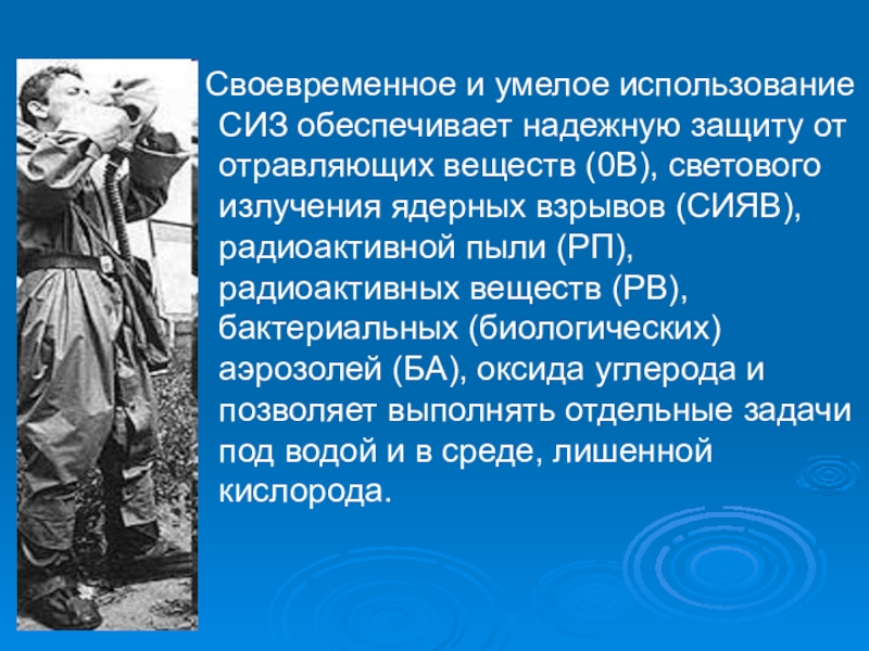 Своевременное и умелое использование СИЗ обеспечивает надежную защиту от отравляющих веществ (0В), светового излучения ядерных взрывов