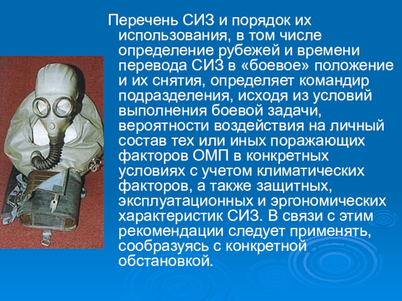 рубежей и времени перевода СИЗ в «боевое» положение и их снятия, определяет командир подразделения, исходя из условий выполнения боевой задачи, вероятности воздействия на личный состав тех или иных поражающих факторов ОМП в конкретных условиях с учетом климатических факторов, а также защитных, эксплуатационных и эргономических характеристик СИЗ. В связи с этим рекомендации следует применять, сообразуясь с конкретной обстановкой.