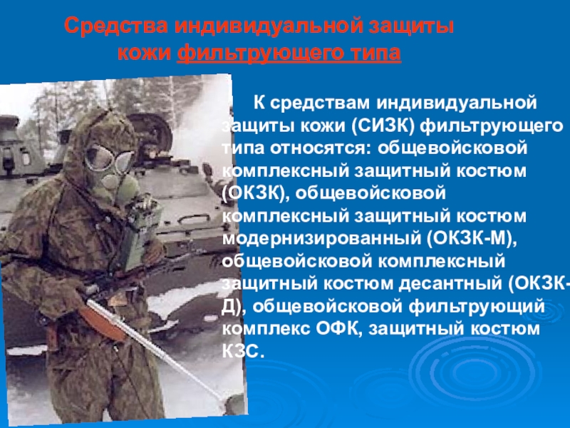 средствам индивидуальной защиты кожи (СИЗК) фильтрующего типа относятся: общевойсковой комплексный защитный костюм (ОКЗК), общевойсковой комплексный защитный костюм модернизированный (ОКЗК-М), общевойсковой комплексный защитный костюм десантный (ОКЗК-Д), общевойсковой фильтрующий комплекс ОФК, защитный костюм КЗС.