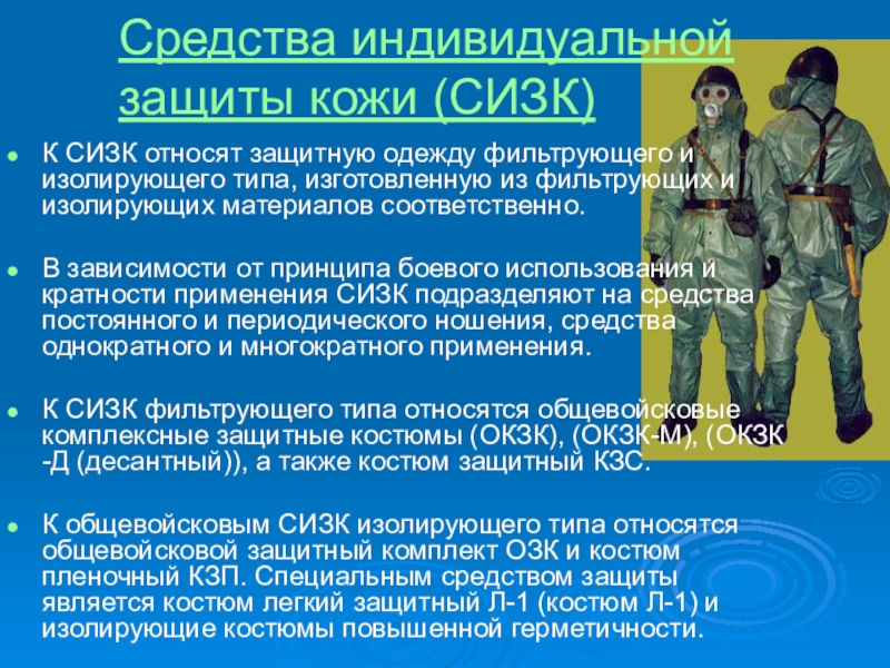 К СИЗК относят - защитную одежду фильтрующего и изолирующего типа, изготовленную из фильтрующих и изолирующих материалов. В зависимости от принципа боевого использования и кратности применения СИЗК подразделяют на средства постоянного и периодического ношения, средства однократного и многократного применения