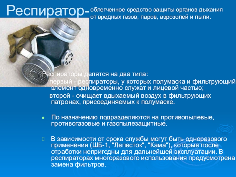 Респиратор-Респираторы делятся на два типа:   первый - респираторы, у которых полумаска и фильтрующий элемент одновременно