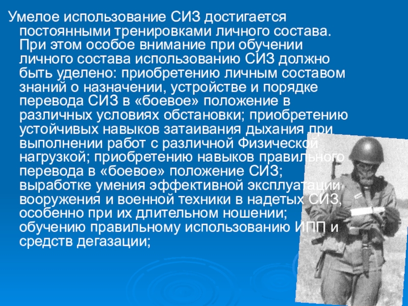 особое внимание при обучении личного состава использованию СИЗ должно быть уделено: приобретению личным составом знаний о назначении, устройстве и порядке перевода СИЗ в «боевое» положение в различных условиях обстановки; приобретению устойчивых навыков затаивания дыхания при выполнении работ с различной Физической нагрузкой; приобретению навыков правильного перевода в «боевое» положение СИЗ; выработке умения эффективной эксплуатации вооружения и военной техники в надетых СИЗ, особенно при их длительном ношении; обучению правильному использованию ИПП и средств дегазации;