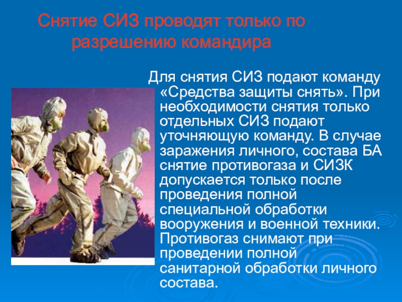 Снятие СИЗ проводят только по разрешению командира Для снятия СИЗ подают команду «Средства защиты снять». При необходимости