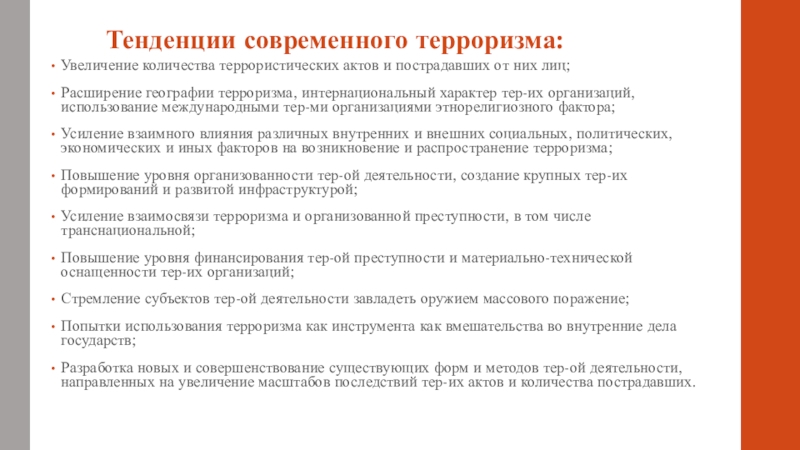 Разработка новых и совершенствование существующих форм и методов тер-ой деятельности, направленных на увеличение масштабов последствий тер-их актов и количества пострадавших.