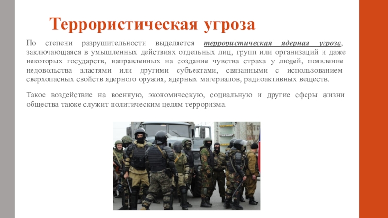 По степени разрушительности выделяется террористическая ядерная угроза, заключающаяся в умышленных