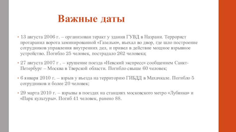 29 марта 2010 г. – взрывы в поездах на станциях московского метро «Лубянка» и «Парк культуры». Погиб 41 человек, ранено 88.