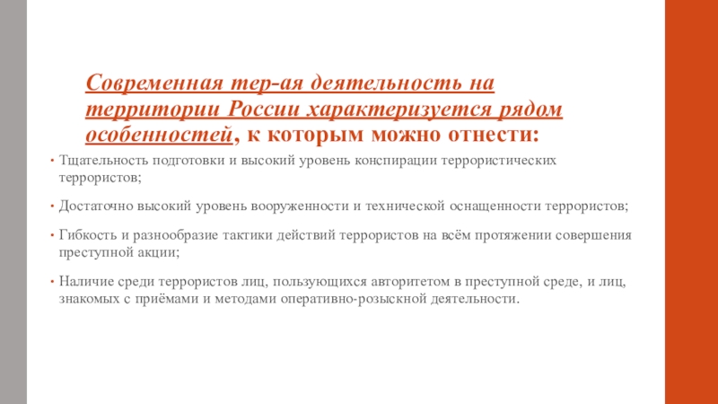 Тщательность подготовки и высокий уровень конспирации террористических террористов;
