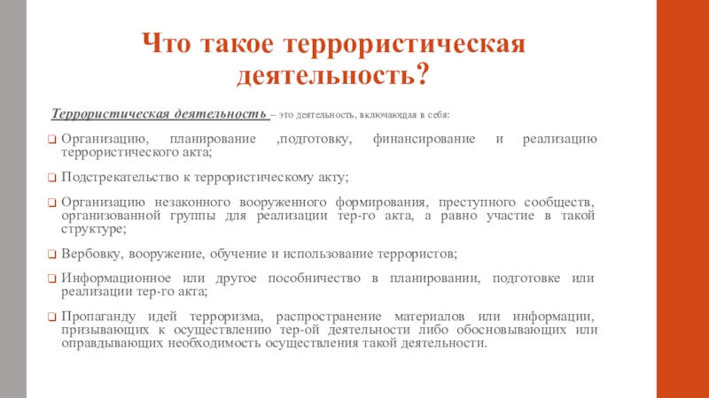 Слайд 12Террористическая деятельность и ее содержание; виды деятельности: