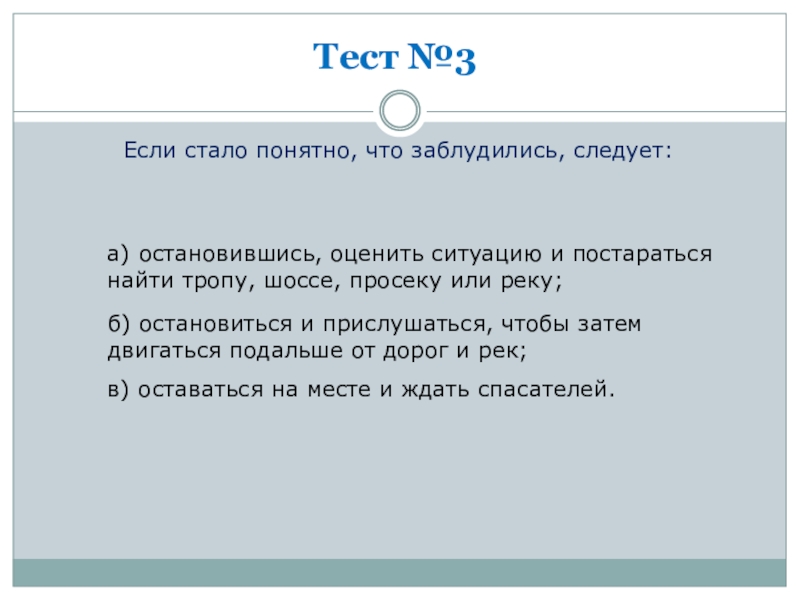 а) остановившись, оценить ситуацию и постараться найти тропу, шоссе, просеку или реку;