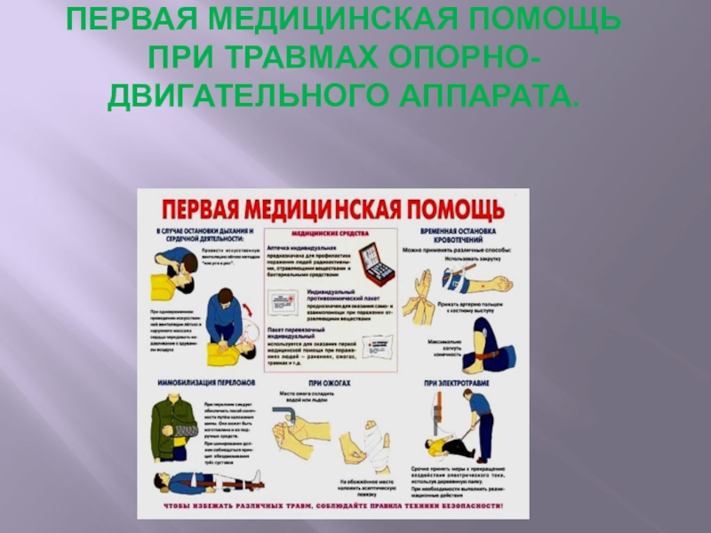 Слайд 2Первая медицинская помощь при травмах опорно-двигательного аппарата.