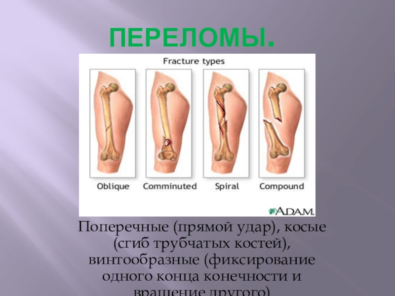 Переломы.Поперечные (прямой удар), косые (сгиб трубчатых костей), винтообразные (фиксирование одного конца конечности и вращение другого)