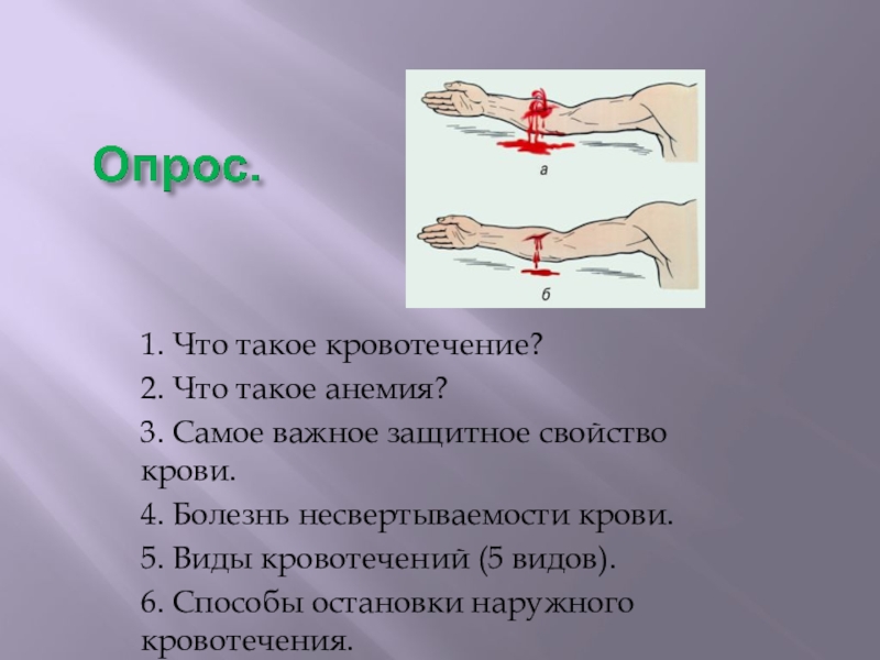 1. Что такое кровотечение?2. Что такое анемия?3. Самое важное защитное свойство крови.4. Болезнь несвертываемости крови.5. Виды кровотечений