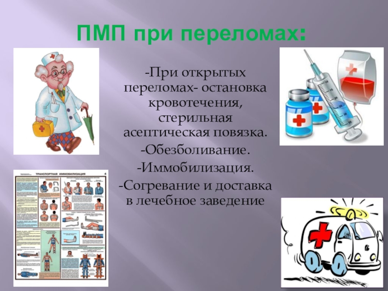 ПМП при переломах:-При открытых переломах- остановка кровотечения, стерильная асептическая повязка.-Обезболивание.-Иммобилизация.-Согревание и доставка в лечебное заведение