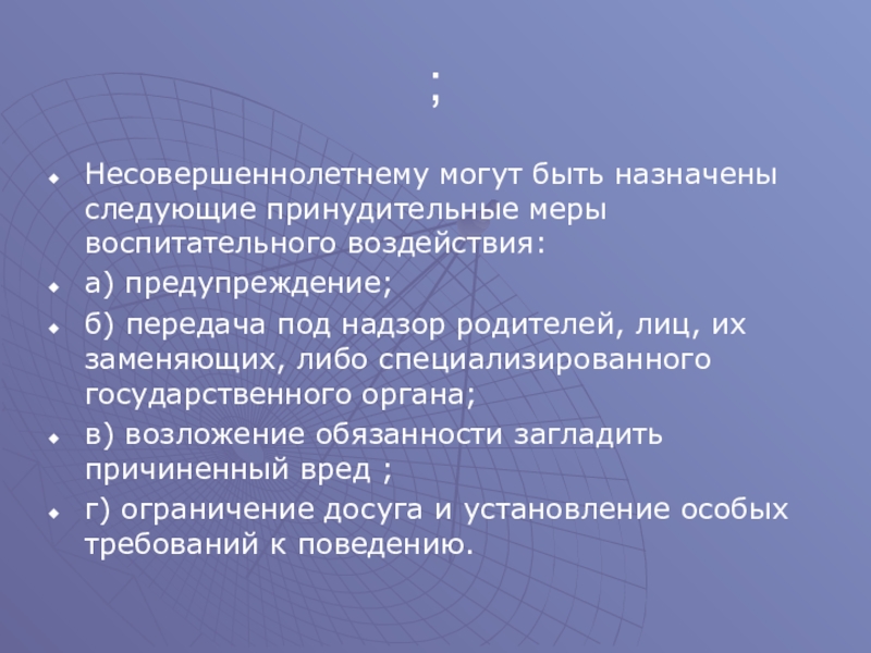 Несовершеннолетнему могут быть назначены следующие принудительные меры воспитательного воздействия: